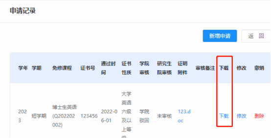 3.2打印申请表:完成申请后,页面下方将生成申请数据表,点击下载,并核对《研究生英语免修免考申请表》,打印后连同相关英语水平成绩证明(原件及复印件1份,原件验后返还),在新生入学报到时上交至各所在学院。