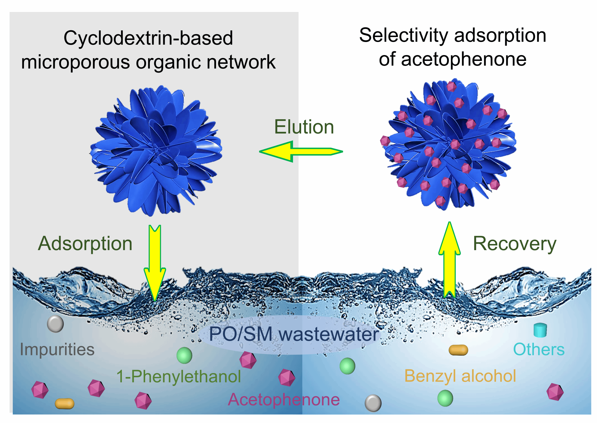 制备高效、可再生、比表面积大、稳定性和选择性好的多孔材料用于回收石化副产物中的苯乙酮(AP)和1-苯乙醇(PE)具有重要意义。但是,AP和PE由于结构相近、性质相似,其分离极具挑战。为此,该团队选择不同的卤代环糊精(CD)和芳香炔合成了九种新型的环糊精基微孔有机网络材料(CD-MONs),通过吸附剂和吸附质之间氢键、π-π和范德华相互作用力的差异实现了石化副产物中AP和PE的高效、高选择性分离和回收再利用,揭示了CD-MONs良好的复杂样品分离性能和应用潜力。