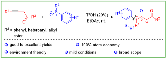 管西栋博士与中国医学科学院药物研究所卢诗超副研究员合作,基于直接区域选择性活化策略,利用β-炔基取代的羰基化合物(酮或酯)在酸催化下可原位异构化为累积二烯的特性,通过亚砜类亲核试剂的区域选择性的加成和后续σ迁移重排,实现了羰基γ位选择性芳基化,进而建立了合成1,3-二羰基化合物的新方法。该方法具有良好的底物普适性、完全的区域选择性、100%的原子经济性、条件温和、反应高效等特点。此外,新方法还成功应用于抗锥虫药非昔硝唑和非甾体抗炎药舒林酸的后期衍生化,极大地促进了该类分子的药理学研究。