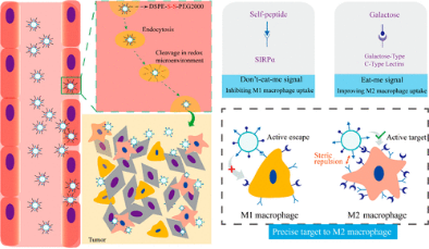 药物靶向递送通过配体-受体的识别来提高制剂对靶细胞的识别及药物疗效。M2型巨噬细胞是肿瘤治疗的重要靶点,但M2型巨噬细胞上调的受体也在M1型巨噬细胞上表达,如何实现靶向特异性仍是一个重要挑战。有基于此,唐宜轩课题组提出了联合Eat Me和Don’t Eat Me信号提高对M2型巨噬细胞的精准识别。首先,CD47蛋白衍生的Self肽与巨噬细胞表面受体SIRPα蛋白互作后激发Don’t Eat Me信号通路能够抑制巨噬细胞的吞噬作用,该课题组同时证实Don’t Eat Me信号更倾向于抑制M1型巨噬细胞的吞噬作用;半乳糖与M2型巨噬细胞表面高表达的半乳糖受体(MGL)识别会引发Eat Me信号;受体-配体间的识别存在范围选择性,半乳糖和MGL的对接会间接形成针对Self肽-SIRPα蛋白互作的空间位阻,抑制M2型巨噬细胞对Don’t Eat Me信号的响应。以盐酸阿霉素为模型药物,体外毒性实验显示出该脂质体具有良好的靶向选择性。进一步在脂质体表面修饰肿瘤微环境响应的PEG链以降低对肝脏的误靶及提高在肿瘤中的蓄积,结果显示该递药系统表现出了良好的抑瘤作用。