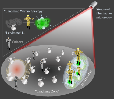 该策略是指将“地雷”(无荧光的探针)均匀地“埋”在细胞基质中,细胞基质中某细胞器产生的ONOO-作为“工兵”,踩上“地雷”触发“保险丝”,导致“地雷爆炸”(荧光开启)释放出荧光团,从而实现对ONOO-的捕获。基于这一策略,研究人员以4- (N,N-二乙氨基)水杨醛共轭染料为荧光团,通过与2-肼吡啶缩合,合成了充当“地雷”的探测器L-1—一种高特异性的开启型荧光探针。