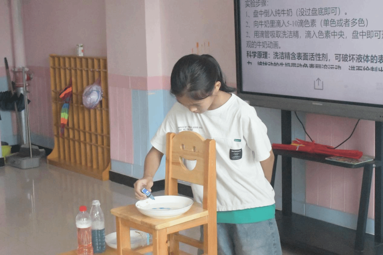 科学实验拓展课上,队员们演示了“简易温度计”、“拉不开的书”、“彩色喷泉”、“牛奶动画”等趣味实验操作。队员们耐心细致地讲解实验原理,同学们积极踊跃交流互动并上前动手操作实验,认真观察奇妙现象,不时与小伙伴分享精彩瞬间。一下午的实验课程不仅激起了小朋友们强烈的好奇心和求知欲,也启发大家去发现身边的奥妙,探索身边的未知,用独特的智慧打开通向科学世界的大门。