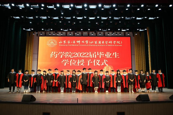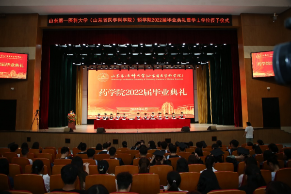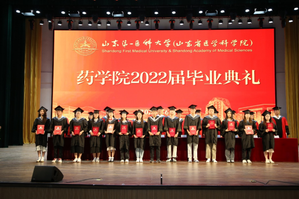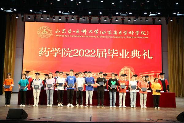 典礼在雄壮的国歌声中拉开帷幕。伴随着热烈的掌声,药学院党委书记史仁玖宣读《关于表彰2022届省级、校级优秀毕业生的通报》;主席台就座的领导老师分别为省级、校级优秀毕业生代表颁发荣誉证书,为本、专科毕业生代表颁发学位证书和毕业证书。