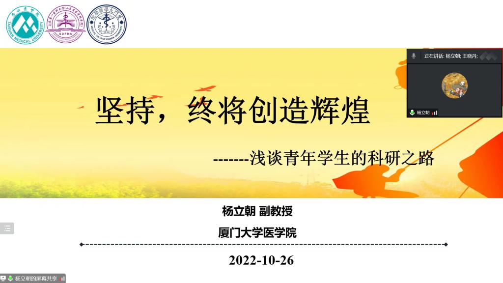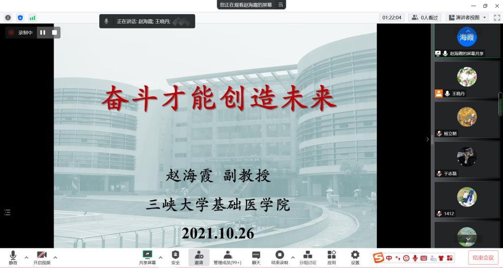 来自厦门大学基础医学院杨立朝校友和三峡大学基础医学院赵海霞校友首先感谢母校老师们的信任,更感恩学院的教育培养,并且结合自身学习与工作的经历,分别从心怀感恩、胸怀梦想、奋斗青春这三个方面与学弟学妹们分享了自己在奋斗道路上的收获与感悟。他们寄语在座学弟学妹:世界很大,要去看看,再好,别忘了危机与奋斗;再难,别忘了梦想与坚持;再忙,别忘了读书与锻炼。人生就是一场长跑,尚未启程者请迈开脚步,前行者请始终如一。互动环节中,许多同学结合自己所学专业和对未来职业生涯规划中的疑惑向两位校友提问,大家都认真聆听并耐心解答。