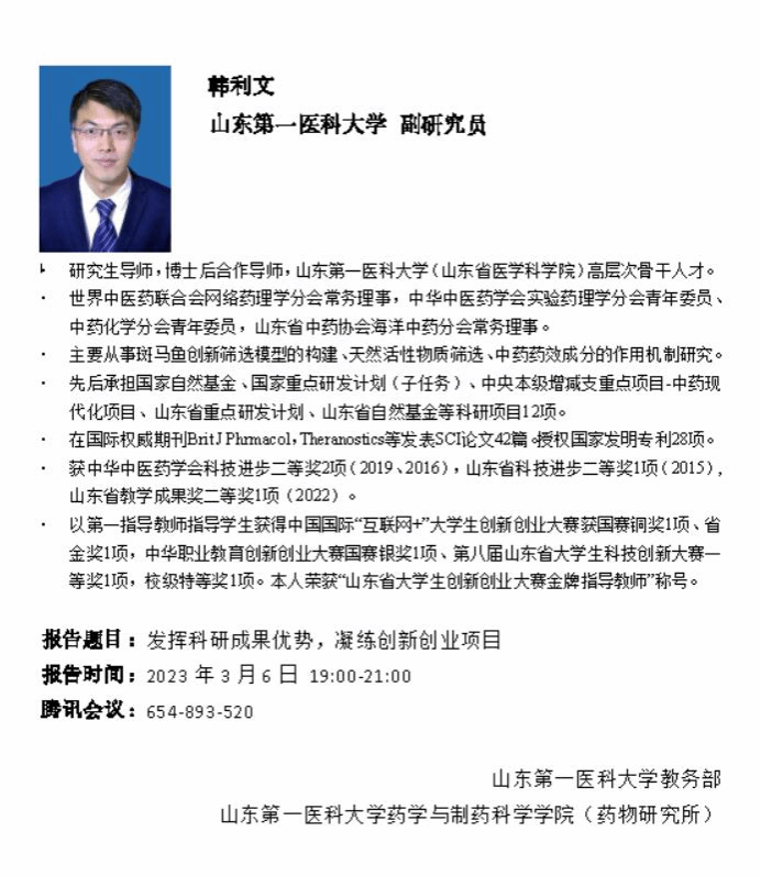 韩利文副研究员是云顶集团党委联合党支部党员,研究生导师,博士后合作导师,校(院)高层次骨干人才,以第一指导教师指导学生获得中国国际“互联网+”大学生创新创业大赛获国赛铜奖1项、省金奖1项,中华职业教育创新创业大赛国赛银奖1项、第八届山东省大学生科技创新大赛一等奖1项,校级特等奖1项,是山东省大学生创新创业大赛金牌指导教师。