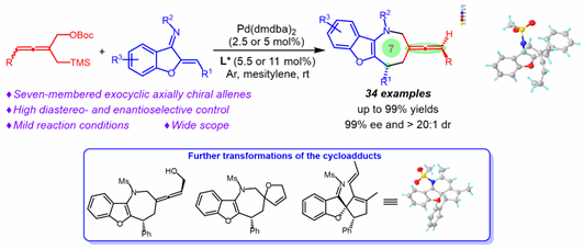 轴手性联烯结构往往存在于天然产物、生物活性化合物、药物分子、有机配体和催化剂。因此,从简单易得的原料出发,发展各类型轴手性联烯化合物的不对称合成方法引起了人们的广泛关注。在已报道的联烯相关天然产物和药物分子中,轴手性环外联烯是一类重要的分支。然而,与普通线性轴手性联烯相比,构建轴手性环外联烯骨架的策略仍然很少报道。基于本课题组在钯催化环加成反应中的研究基础,本研究工作利用钯催化消旋的联烯基三亚甲基甲烷与氮杂二烯的不对称[4+3]环加成反应,高效构建一系列具有稠环氮杂䓬骨架的轴手性环外联烯类化合物。该反应能同时控制产物的中心手性和轴向手性,使其具有良好至优秀的产率,以及出色的非对映选择性和对应选择性(dr>20:1, ee>99%)。此外,该反应可以成功在放大量情况下进行且所得到的七元环外轴手性联烯产物,通过衍生化实验可以得到其他类型的手性联烯醇或螺环类衍生物,为新型杂环类药物创制提供简洁高效的新方法和结构多样的新化合物。