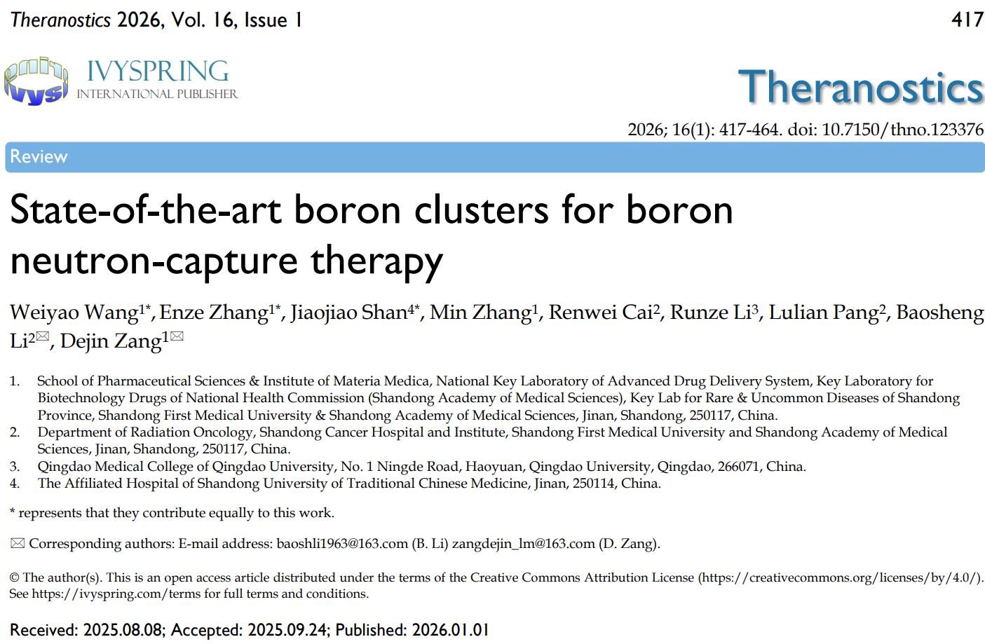参考文献:Wang W, Zhang E, Shan J, et al. State-of-the-art boron clusters for boron neutron-capture therapy. Theranostics. 2026; 16(1): 417-464. doi: 10.7150/thno.123376.