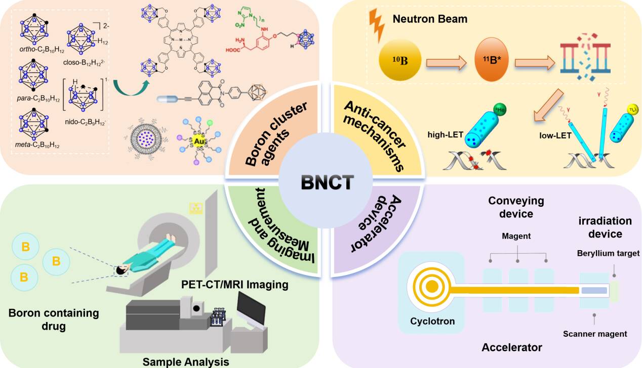 该综述系统总结了BNCT的研究进展:在硼簇药物构建策略方面,不仅包括利用L型氨基酸转运蛋白靶向的氨基酸载体、兼具光动力治疗协同效应的卟啉载体及实现靶向成像治疗一体化的肽载体等小分子载体,还涵盖借助EPR效应富集肿瘤的脂质体等纳米药物;其抗癌机制主要是通过高能粒子诱导肿瘤细胞DNA双链断裂和复杂簇状损伤,并依p53状态触发凋亡或有丝分裂灾难等细胞死亡途径,可通过HMGB1、γ-H2AX等生物标志物评估疗效;可视化评估技术方面,宏观上采用PET/CT和MRI追踪硼分布与浓度,微观则借助中子俘获放射自显影、二次离子质谱及电子能量损失谱实现亚细胞水平检测;设备技术上,静电加速器、射频加速器等核心技术不断发展,日本NeuCure®系统、中国厦门弘爱医院加速器系统等已进入临床,全球在靶材料系统和束流整形装置上持续突破。