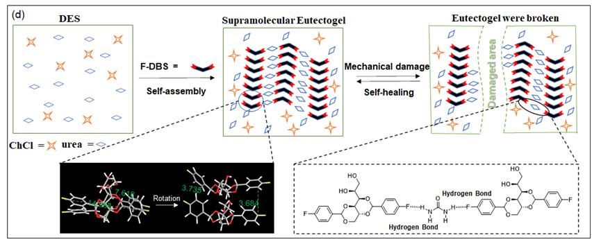 具有多功能的自修复深共晶凝胶由于其高导电性、非挥发性和绿色无毒等性质在软材料领域引起了广泛关注。凝胶的形成需要凝胶因子和溶剂间达到特定的动态平衡。深共晶溶剂的良好的溶解性以及深共晶凝胶体系的复杂性使自修复深共晶凝胶的形成充满了挑战。为实现这一目标,研究团队设计合成了一系列卤素取代的DBS类化合物(X-DBS)。X-DBS形成的深共晶凝胶表现出优异的自愈能力。深共晶凝胶的自修复特性和高离子电导率使其在智能离子导体、界面润滑和染料吸附等方面表现出较好的潜在应用。