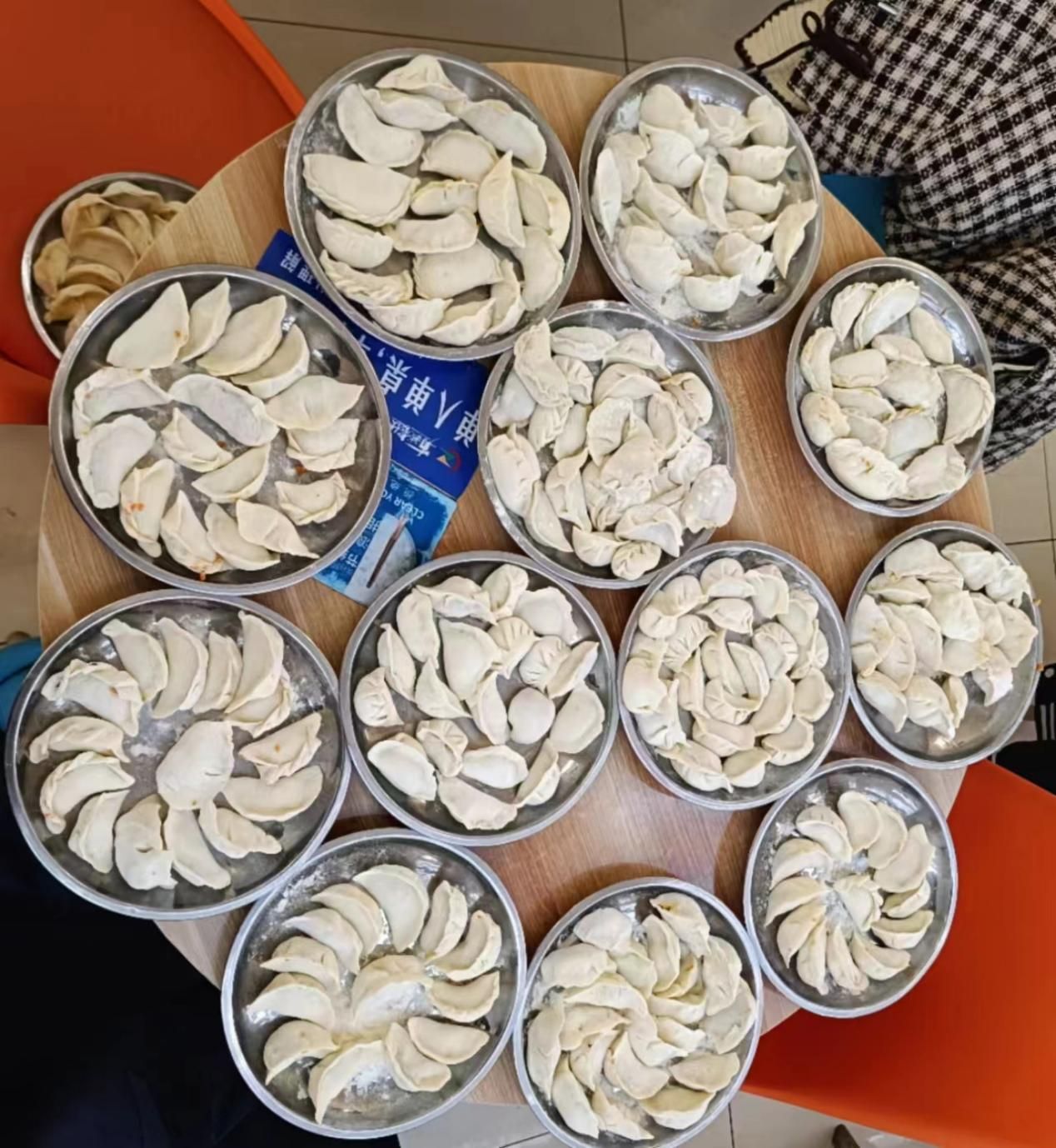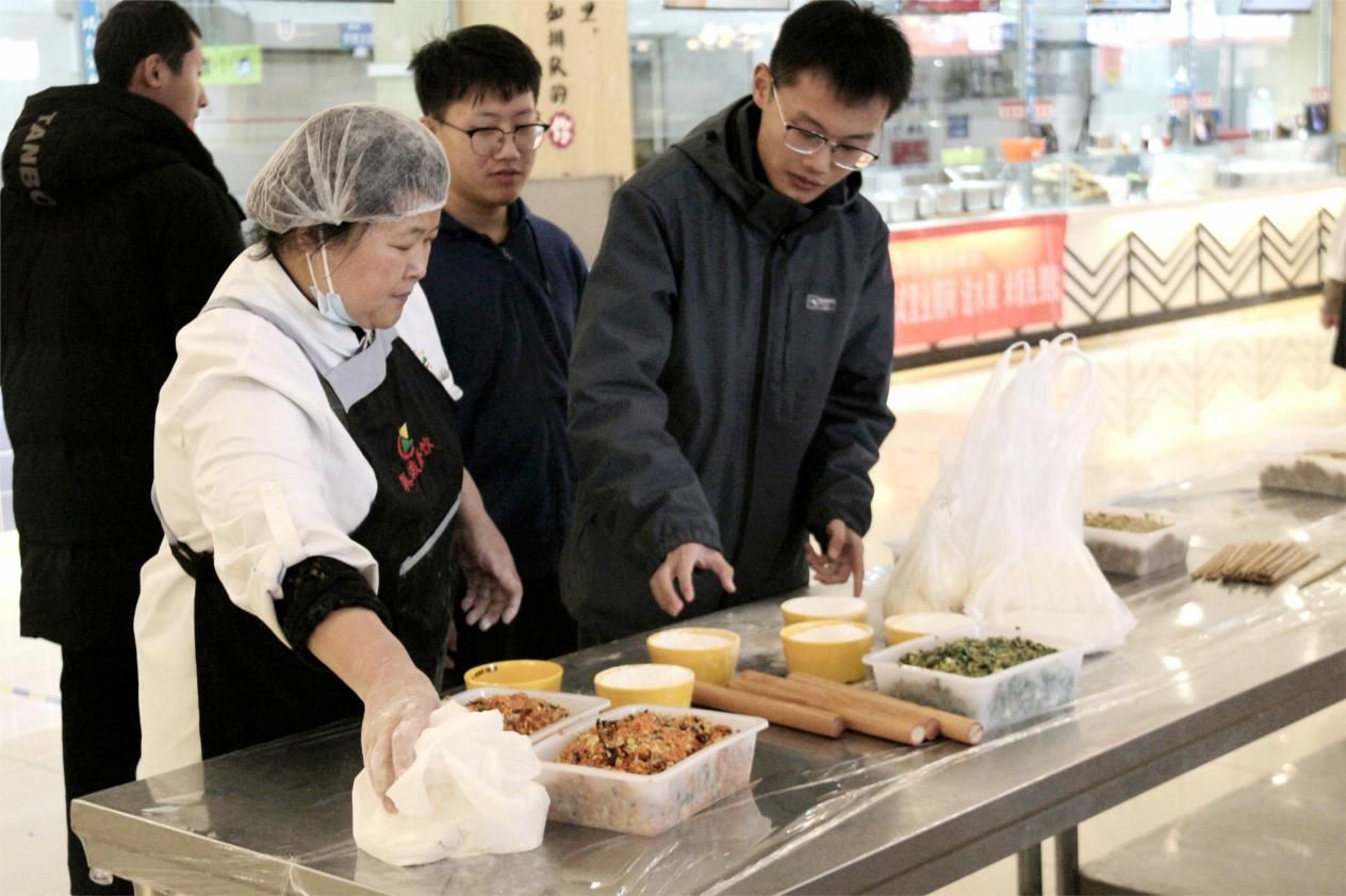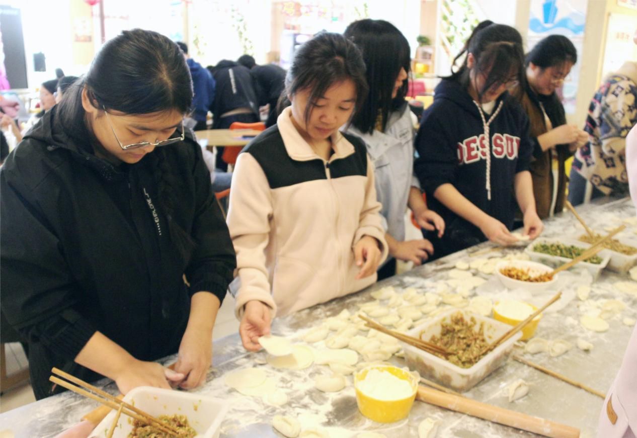 食堂的餐桌上摆满了包饺子所需的食材和工具,同学们热情高涨,聚集一堂,在食堂阿姨的指导下学习包饺子的技巧。学习后,同学们进行明确分工,有的负责揪面剂子,有的负责擀面皮,有的负责包饺子,大家各司其职,有条不紊,其乐融融好不热闹。在包饺子过程中,同学们展现出了各自的技巧理解,其中不少同学表现出了精湛的技艺,他们手法熟练,有些饺子形状独特,创意十足,有些饺子圆润可掬,精美可爱,饱含着同学们对幸福美好生活的期许。