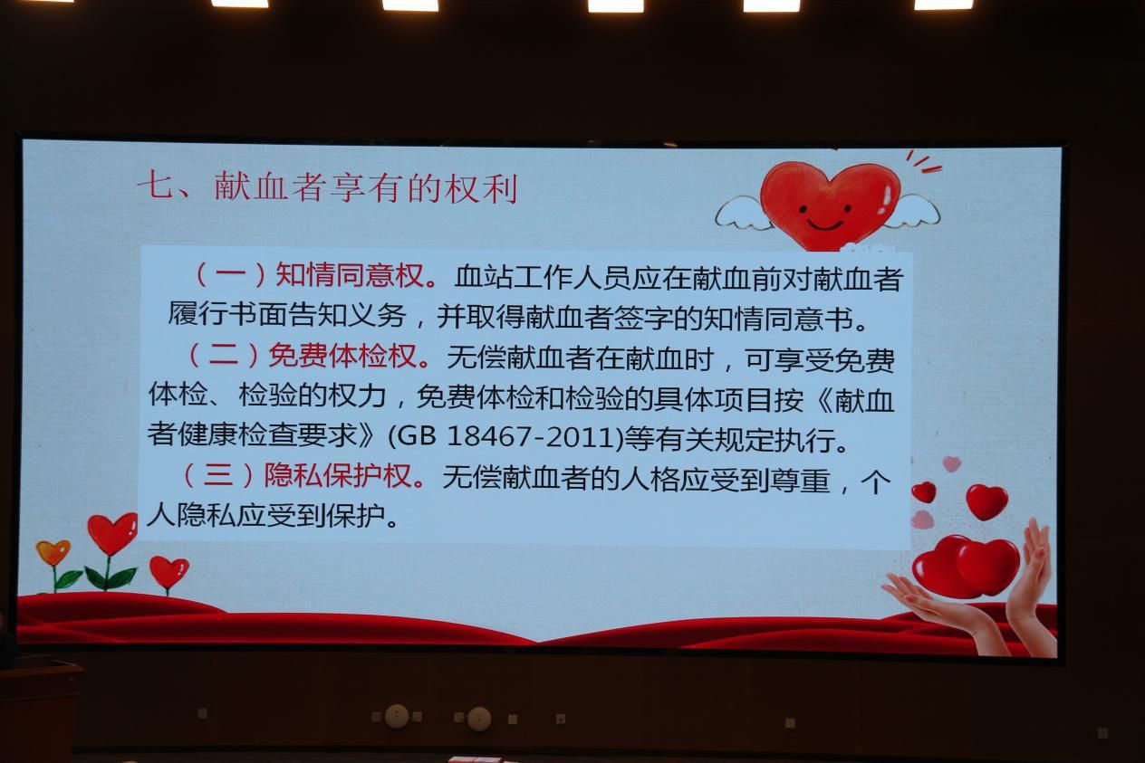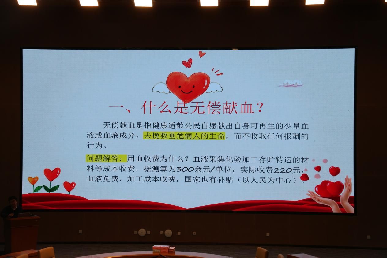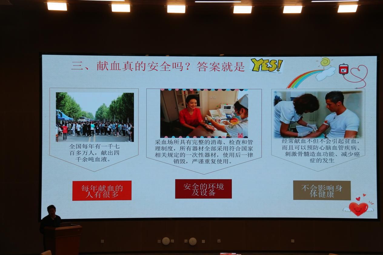 宣讲会伊始,梁老师首先向在场同学们介绍了无偿献血的条件、献血过程、献血后的注意事项等一系列的基本知识,还详细解释了献血对于社会和个人的意义,并强调无偿献血是无私奉献、救死扶伤的崇高行为,是每个适龄健康公民对社会应尽的义务。