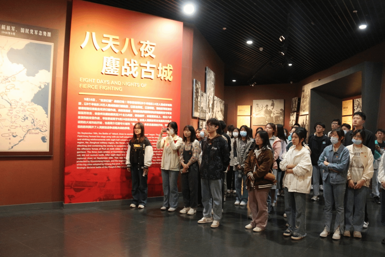纪念馆工作人员从“和战博弈 齐鲁硝烟”、“运筹帷幄 剑指济南”、“厉兵秣马 蓄势待发”、“八天八夜 鏖战古城”、“战略决战 凯歌行进”、“接管济南 泉城新生”、“英魂长眠 日月同辉”、“新时代 新泉城”8各部分生动讲解济南战役光辉历史和新时代红色基因在济南赓续发展,陈列厅里展物,向大家讲述着无数的仁人志士,为了国家、民族抛头颅洒热血的悲壮故事,同学们深刻感受到“爱党爱军、依靠人民、英勇顽强、敢于胜利”的济南战役精神。