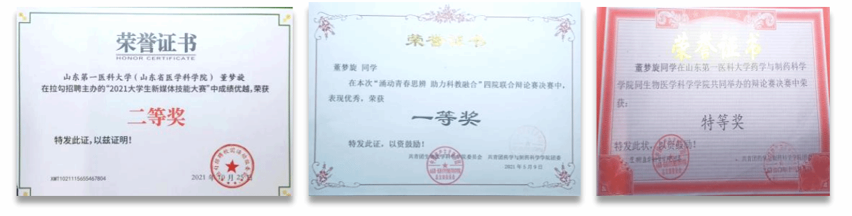 “纸上得来终觉浅,绝知此事要躬行。”我之前的学习过程中没有真正接触过实验。所有对实验学习都是通过看陈旧的学习视频完成的。所以在大一刚入校我就申请加入了韩利文博士的实验室。通过在实验室的探索,我学会了各种各样的仪器和实验方法。在大二学年,担任项目负责人,和实验室的小伙伴一起努力,从院赛到校赛,校赛到省赛,最后登上国赛的舞台。不断试错,不断总结,相继取得了国家级立项1项,校级立项1项,科研项目实习1项,发表中文核心文章一篇,申请国家专利4项,获得第五届“黄炎培杯”中华职业教育创新创业大赛国家级银奖、第八届“互联网+”大学生创新创业大赛国家级铜奖、第十三届“挑战杯”大学生创业计划竞赛省级铜奖等省级及国家级奖励,并且第六届“黄炎培杯”中华职业教育创新创业大赛成功入围国赛。