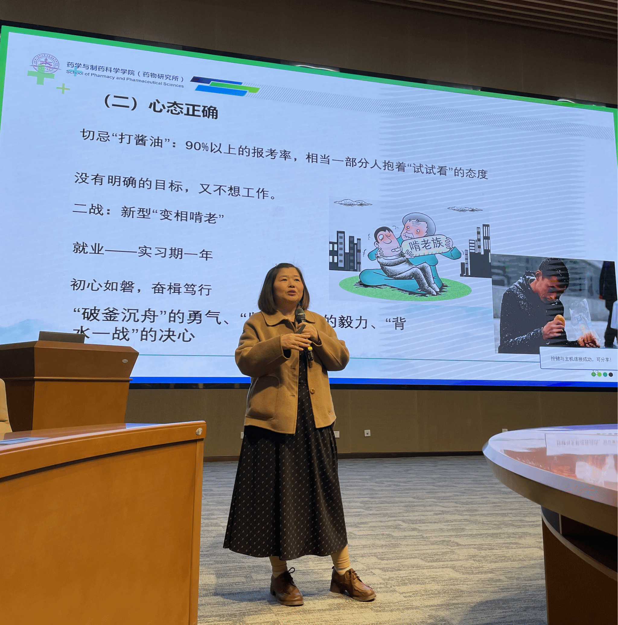 随后,汪海洋以“红色筑梦 自强不息 做药界未来新星”为主题,聚焦职业生涯和个人成长,为学子们分析了当前的考研形式与未来的就业情况。他鼓励同学们应当志存高远,利用好科教融合院(所)的雄厚师资力量及优势科研平台,学有所思、学有所获、学有所用,为个人的职业生涯夯实专业基础,为国家未来医药领域做出应有的贡献。