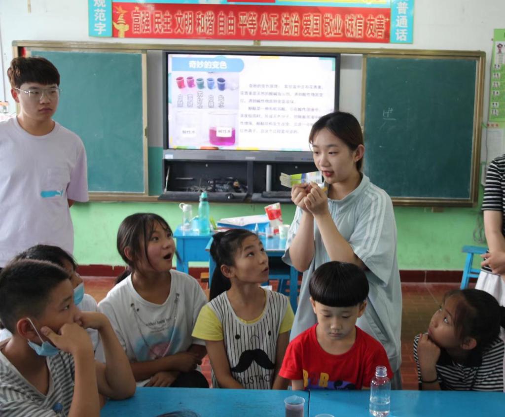 服务队员们首先通过有趣的科学实验为儿童们解释日常生活中出现的一些科学现象,如“模拟火山爆发”——酸碱中和反应的介绍、“奇妙的变色”——酸碱指示剂的应用、“牛奶动画”——表面张力的认识和介绍等,不仅激发起了儿童们对科学的兴趣和求知欲,还启发他们在生活中用饱含洞察力的眼光去发现一个更加奇妙的世界,为他们打开通向科学世界的大门。