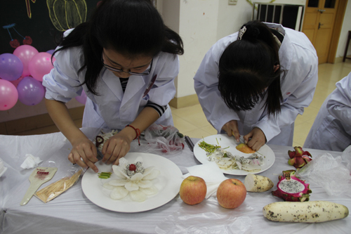选手们争分夺秒的制作过程中,场下观众与主持人也积极互动,被誉为“快乐水果”是哪种水果、感冒忌用哪种食物等问题,不仅调动了现场的气氛,而且丰富了同学们关于饮食的基本知识。经过激烈的比拼,来自2013级化学制药技术专科2班代表队的《蝶恋花》及2013级药学本科3班代表队的《让爱飞翔》获得了本次比赛的一等奖。