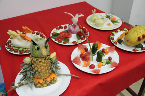水果派对大比拼分为“食雕沙龙”和“水果拼盘”两个环节,共有13个参赛小组。此次比赛可谓是龙争虎斗,同学八仙过海各显神通,作品展现出了他们天马行空般的想象力和创造力,各式造型新颖、寓意深刻的作品从参赛选手的手中脱颖而出。栩栩如生的“鹤”、寓意莘莘学子在泰医不断成长的“梦之篮”、水萝卜和莴苣雕刻而成的“蝶恋花”等,每件参赛作品都色彩鲜艳,别出心裁,吸引了在场的每一位观众。