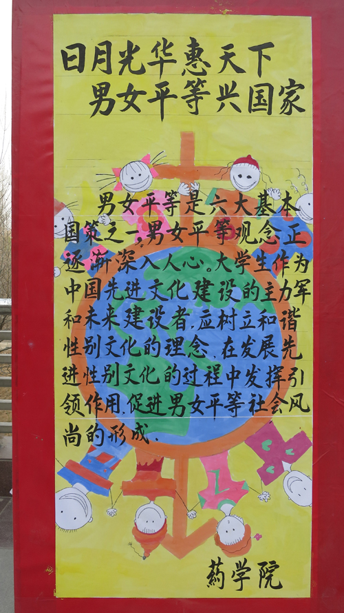 药学院抓住这一契机,于3月份在全院开展了男女平等基本国策宣传活动,通过制作主题展板、开设专版专栏等活动,大力宣传这一基本国策,宣传《宪法》、《妇女权益保障法》、《山东省实施〈妇女权益保障法〉办法》等相关法律法规。活动结合女大学生社会地位及现状,如怎样应对女大学生面临的就业歧视等问题,普及了男女平等相关知识。活动呼吁广大女大学生要树立自尊、自信、自立、自强的意识,推动男女平等基本国策在高校中深入人心。
