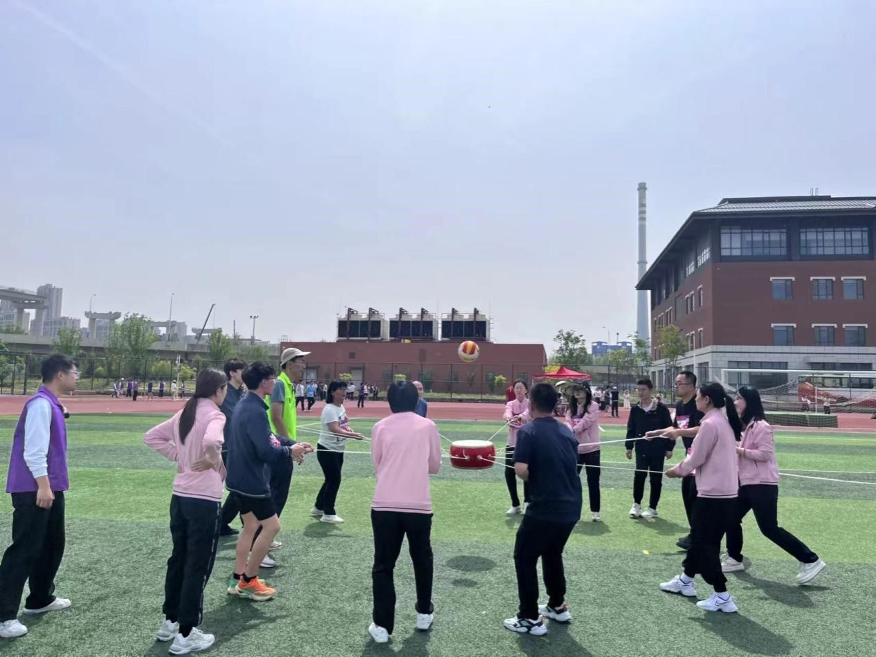 趣味赛场上,教师们分别进行了定点投篮、同心击鼓球、混合拔河、充气毛毛虫、托球跑五项比赛。大家斗志昂扬、奋勇争先,在定点投篮赛中于三分线外奋力投篮,在充气毛毛虫赛里体验运动的无限乐趣,在托球跑中稳中求快、共创佳绩。拔河比赛中,教师们分成两队进行力量的交锋,他们拉起绳索,纵情发力,双方你来我往,伴随着观众们热情的加油助威,场面热闹非凡。兴奋和喜悦写在了每位教职工的脸上,掌声、笑声、喝彩声将氛围推向高潮,热烈的气氛感染和弥漫了整个运动会现场。