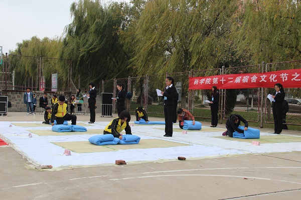 11月7日下午,药学院于老体育场成功举办了第十二届宿舍文化节之叠被子大赛。药学院学团老师出席了本次比赛,来自2014级、2015各班级的50余选手参加叠被子比赛。2015级全体同学观看了比赛。