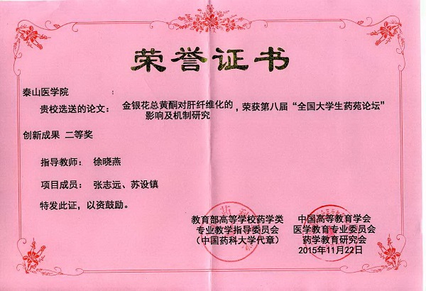 2015年11月20-22日,以“大学生创新创业成果交流”为主题的第八届“全国大学生药苑论坛”在南京举行,我校学生荣获创新成果二等奖和优秀壁报奖。