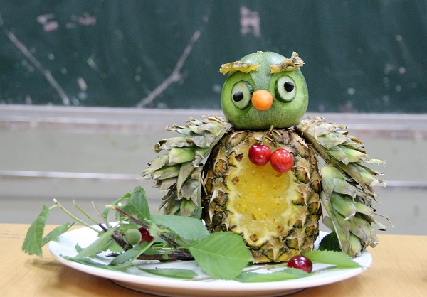 在食装技艺比拼中,选手们争分夺秒,将普通的水果蔬菜设计出精美的外观包装。他们更显神通,发挥天马行空的想象力和创造力,融合智慧和思想火花,精心搭配食材,将手工艺品、果蔬雕刻等新意元素作为点缀,独创设计出精致又寓意深厚的食装艺术品。展品不仅美轮美奂,栩栩如生,解读的各具特色的寓意和灵感更是令人叹为观止。用菠萝雕刻而成的猫头鹰寓意同学们展翅高飞,鞋子状茄子雕塑寓意脚踏实地,都是心与手的杰作。