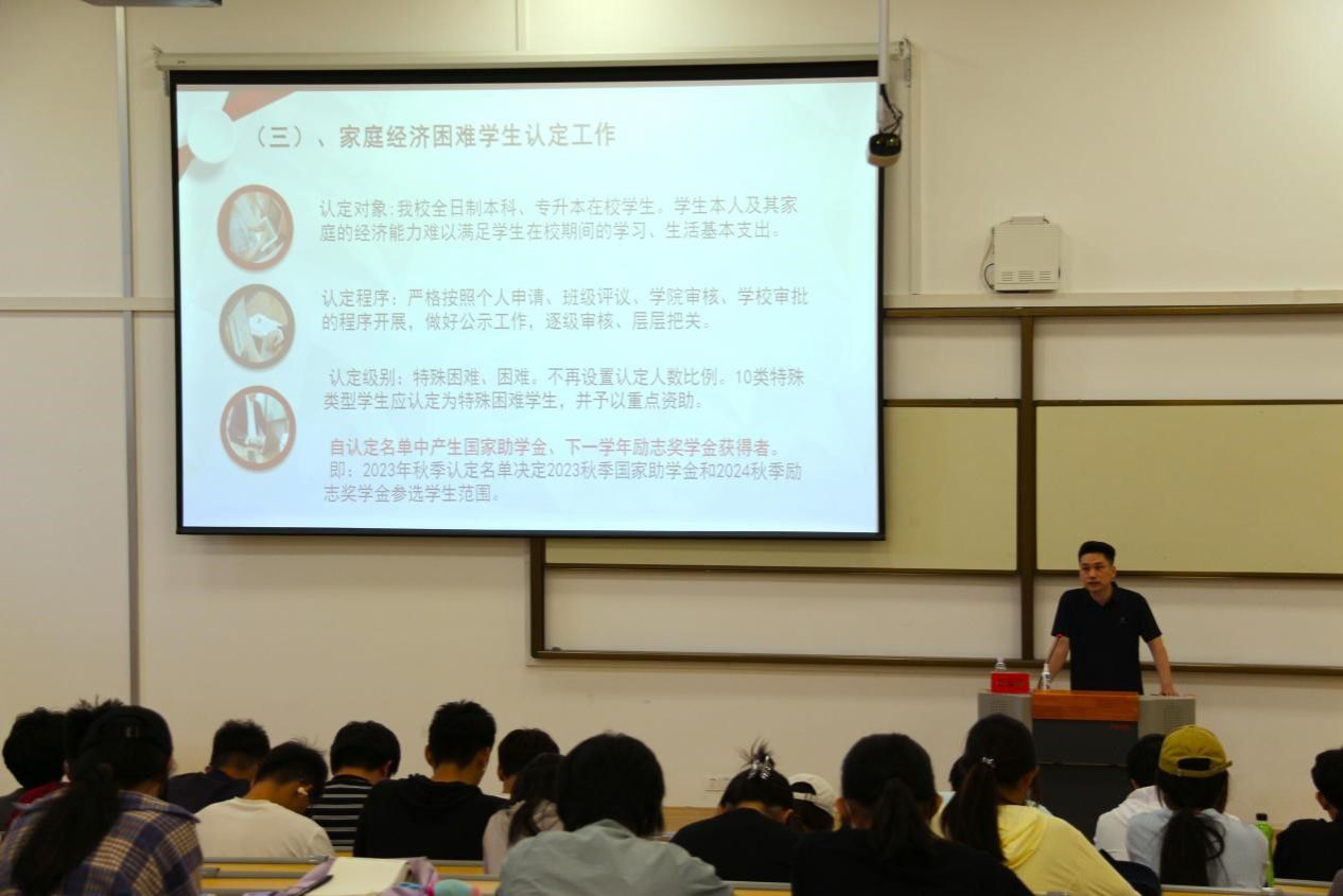 随后,张老师从资助类型、资助程序标准版建设、家庭经济困难学生认定工作三方面介绍我校的资助体系。点明我校设有的保障性、奖励性和发展性三种支付类型,涵盖国家奖学金、校级奖学金、各类补助及发展项目,以促进学生的全面发展并激励优秀表现。校(院)资助程序的进一步加强与完善、家庭经济困难学生认定的认真负责和公平公正,使莘莘学子皆有受教育的机会,为他们带来新的希望。