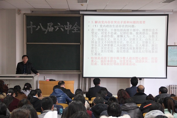 12月7日下午,党的十八届六中全会精神宣讲报告会在教学南楼C1002教室举行。报告会邀请了社科部任冲教授担任主讲,药学院和护理学院全体教职工、部分学生党员和入党积极分子聆听了宣讲报告。