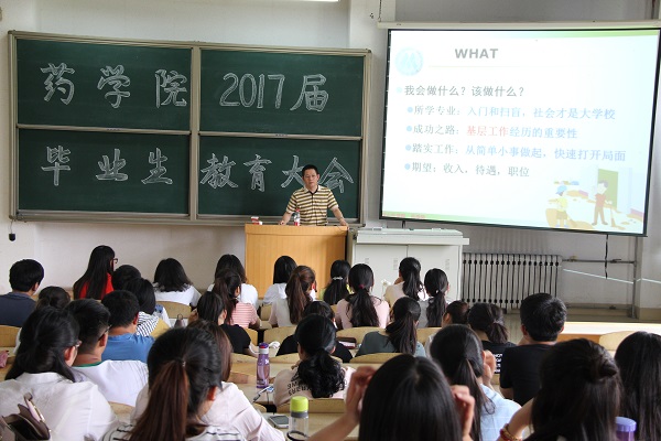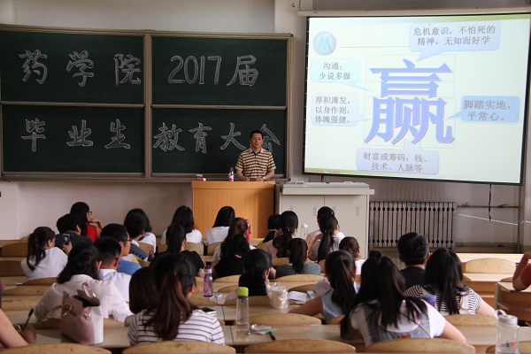 6月15日上午,药学院于教学北楼A3018教室举办了以“放飞青春梦·开启新征程”为主题的毕业教育专题讲座。本次讲座由药学院党委书记龙跃洲主讲,药学院2017届毕业生聆听了讲座。