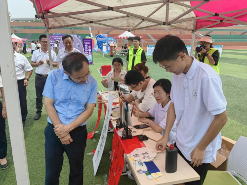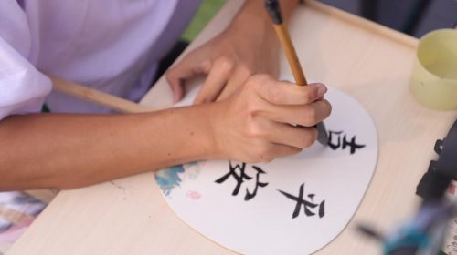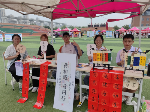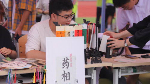 “现场书法题字区”作为本次活动的一大亮点,吸引众多新生驻足观赏。书法爱好者们挥毫泼墨,笔走龙蛇,根据个人需求,现场进行书写题字,将饱含心意的书签、扇面通过游戏的方式赠予新生,展现中华优秀传统文化的独特魅力。这不仅承载着对新生的美好祝愿,送上炎炎烈日中的丝丝清凉,更是对中华优秀传统文化的一次生动传承。