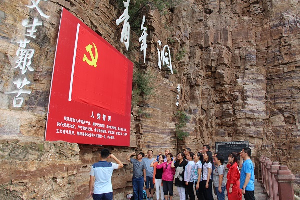 在“青年洞”洞口,全体党员面对党旗重温入党誓词。