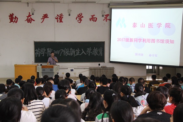 接下来由泰山医学院图书馆的孙副馆长为大家就图书馆的基本情况、使用方法及注意事项进行了讲解。他为家介绍了图书馆各部门的功能与职责,指出下一步要引进新图书,增加藏书量,并向大家介绍了图书的分类方法及书库的分布情况,告诉新生们如何按照分类方法更快地找到图书。他还提到图书馆的自动化管理、科研成果、文献检索以及电子图书的阅读途径和藏书量,并着重指出图书馆读者准则:维持环境卫生,爱护公物,办好借阅手续等。