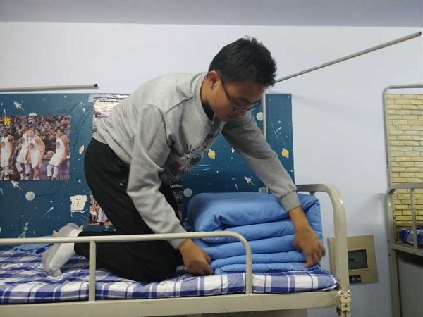 下午4:00,随着一声哨声,内务整理大赛正式开始。在十五分钟将宿舍打乱的过程后,参赛选手4人一组,迅速进入比赛宿舍,分工明确,两人负责爬上床捋平被单和叠被褥,一人负责打扫地面卫生和清理阳台,一人负责摆放物件,比赛如火如荼地进行着,参赛选手紧张有序、争分夺秒、快中求稳、干劲十足,短短30分钟的比赛时间,将原本狼藉的宿舍变得洁净如初,床铺铺设平整,地面洁净如洗,被子叠的方正、棱角分明,物品摆放的整齐美观。整理完毕后老师以及学生代表进行了评比打分。