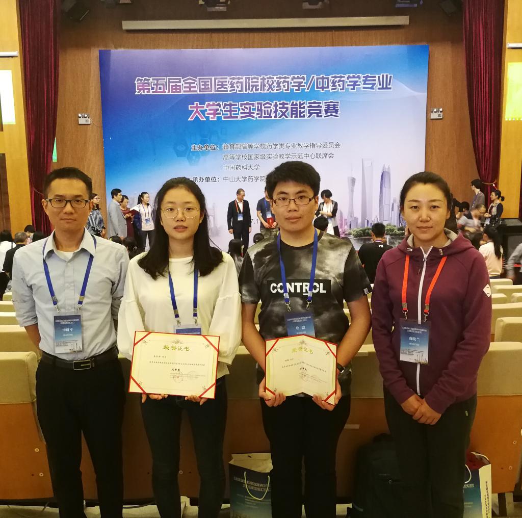 11月8日至10日,由教育部高等学校药学类专业教学指导委员会、高等学校国家级实验教学示范中心药学学科组主办,中山大学承办的“第五届全国医药院校药学/中药学专业大学生实验技能竞赛”在广州举行。共有来自北京大学、中山大学、华中科技大学、中国药科大学、山东大学等94所高校的280多名选手参加了此次竞赛。此次比赛分为实验理论和实验操作两个部分,经过激励的角逐,我校2014级中药学专业徐铠同学获得二等奖,2015级药物制剂专业朱凯丽同学获得三等奖。展现了我校学生规范的实验技能和良好的综合素质。