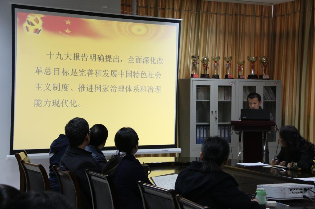 专职辅导员、学生党支部书记贾伍员同志以《十九大报告中的改革关键点》为题发言,他对十九大报告中的改革关键点进行了解析,分别就深化供给侧结构性改革、农村土地制度改革、金融体制改革、推动形成全面开放新格局、改革生态环境监管体制、行政体制改革、国家监察体制改革、完善干部考核评价机制八个方面进行了讲解。