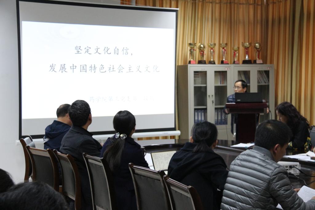 第三党支部书记段瑞同志以《坚定文化自信,发展中国特色社会主义文化》为题发言,他介绍了十九大报告的基本框架,阐明了论述文化自信的主要段落及其在整个报告中的重要作用,他以中国特色社会主义文化源自于中华优秀传统文化、熔铸于红色革命建设文化、植根于中国特色社会主义伟大实践为主线,重点讲述了中华优秀传统文化的主要体现及核心价值理念,归纳概括了红色革命文化和社会主义先进文化。最后他倡议老师们要在习近平新时代中国特色社会主义思想指导下,坚定文化自信,立德树人,做有理想信念、有道德情操、有扎实知识,有仁爱之心的好老师。