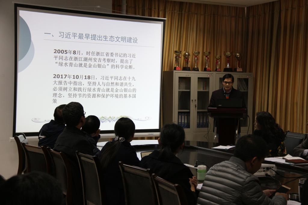第二党支部副书记王福刚同志以《中国梦—加强生态文明建设》为题发言,他说习近平同志在十九大报告中指出,坚持人与自然和谐共生,必须树立和践行绿水青山就是金山银山的理念,坚持节约资源和保护环境的基本国策。我们应从优化国土空间开展格局、全面促进资源节约、加大自然生态系统和环境保护力度等方面大力推进生态文明建设。必须加强生态文明制度建设,把资源消耗、环境损害、生态效益纳入经济社会发展评价体系。
