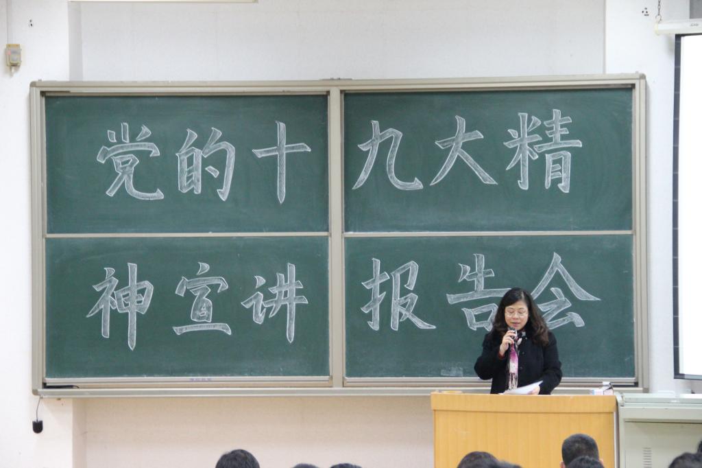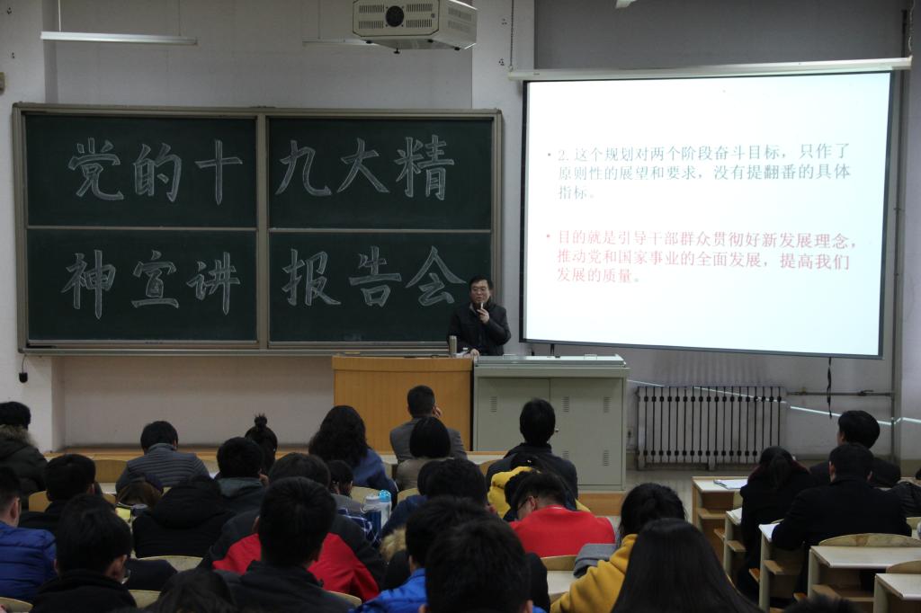 11月29日下午,党的十九大精神宣讲报告会在教学北楼A3018举行。报告会邀请马克思主义学院任冲教授担任主讲,药学院党委副书记主持,全体教职工、学生党员、入党积极分子聆听了宣讲报告。