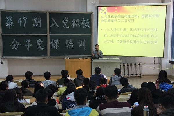 贾伍员老师重点强调了党课考试的纪律性,杜绝抄袭作弊现象的发生和侥幸心理的存在,一定要重视对政治理论的学习;随后对十九大报告中的改革关键点进行了深入探析,让同学们明确了中国未来的发展方向以及为实现这一目标所做出的举措。
