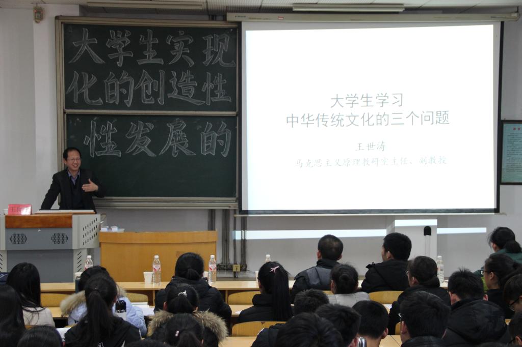 王世涛副教授从三个方面讲解了关于“大学生学习中华传统文化”的问题,让同学们对中华传统文化有了深层次的认知。首先他介绍了文化形态的史观,推荐了德国斯宾格勒的《西方的没落》、英国汤固比的《历史研究》及美国塞缪尔·亨廷顿的《文明冲突论》等文献,希望同学们通过阅读去深刻体会中华传统文化的意义和价值,实现传统文化的创造性转化和创新性发展;接下来,他提出要重点学习传统文化的思想理论,从中华传统文化中汲取营养,结合时代条件加以转化发展;最后,他列举出关于“如何实现传统文化的转化和发展”问题的相关建议,即课程学习和经典研习相结合、认知性学习与本体性学习相结合、学习传统文化与解决实际问题相结合、善于运用现代形式传播和应用及做事与做人相结合。