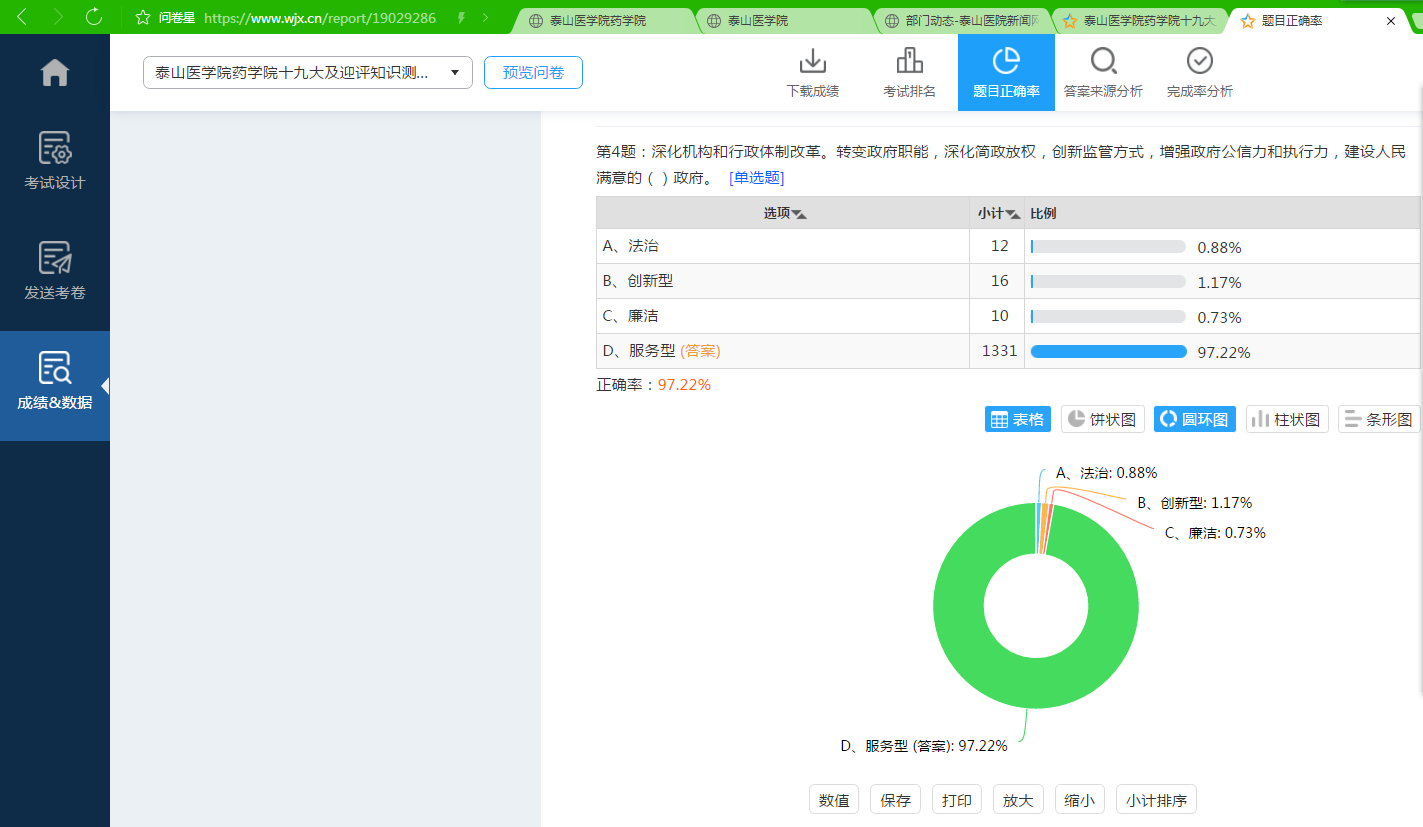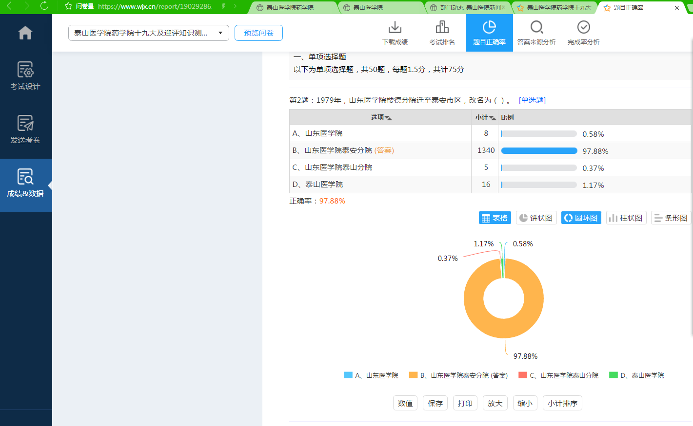 测试结束后,我院对后台数据进行了统计分析。成绩分析方面,以80分为合格,我院共有1338名同学合格,合格率为98.0%。试题分析方面,我院对每一道试题都进行了正答率分析和统计,查漏补缺,有针对性地对出错较多的题目及时予以纠正。