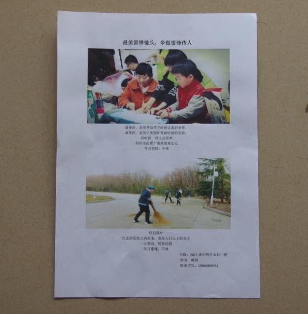 同学们怀揣热情,积极投稿,用镜头传递正能量,镜头刻画传神,配文语言优美,将雷锋精神展现得淋漓尽致。别出心裁的摄影思路和摄影理念,栩栩如生的人物形象和文字描述,让雷锋精神在照片上永恒定格。经过严格地审核筛选,最终来自2017级中药学一班臧硕同学的作品脱颖而出,荣获一等奖。