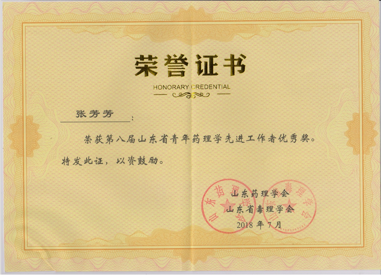 山东省优秀青年药理学工作者奖由山东药理学会设立,旨在褒奖在我省工作并取得优异成绩的青年药理学工作者和在读研究生,激励药理学科青年教师和研究生努力拼搏,促进山东省药理学和医药学事业的发展。该奖项要求获奖者在省内工作或读研,年龄在35周岁以下,以第一作者发表了高水平SCI论文或取得了其他优异成绩。迄今已评选了8届山东省优秀青年药理学工作者奖。