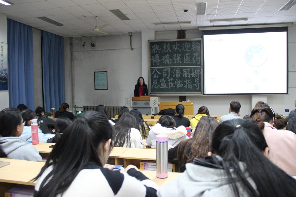 潘总监从药物临床试验现状展开叙述,就新药研发过程、生物等效性试验、药物临床试验、CRO行业发展历程与现状、国家对药物临床试验的管理等问题进行了讲解,重点分析了CRO及CRA的行业背景及其发展前景,剖析了其内涵以及社会的需要度,强调了人才的缺失与学生对此行业不了解的不对等性。还介绍了翰博瑞强公司概括、公司取得的成就以及在CRO行业领域的影响,解答了公司的培训体系、绩效、服务领域、集团优势等同学们关注度较高的几个问题。