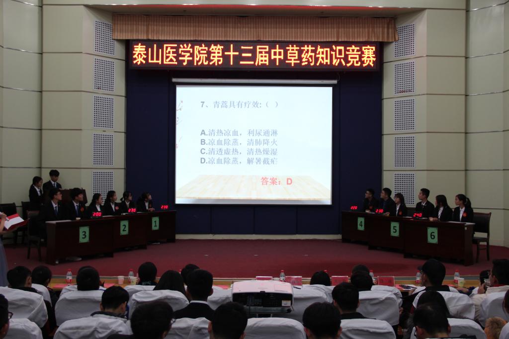 此次竞赛共有六个代表队参加,分别是来自山东农业大学的“药医仁心”队、泰山医学院药学院的 “灵知”队、外国语学院的“丁香”队、护理学院的“Always on the Way”队、第二临床医学院的“二临代表”队、生命科学学院的“To Be the Best”队。本次比赛以“享神农千年瑰宝,扬华夏医药之风”为主题,分为 “势在必得”、“激流勇进”、“简能而任”和“虎口拔须”四个环节。