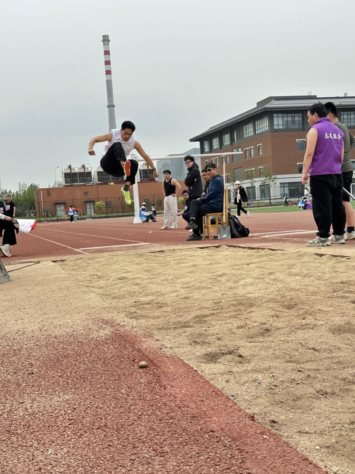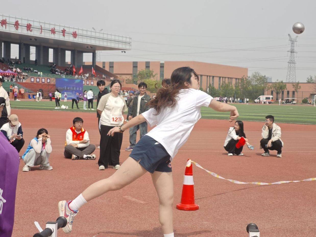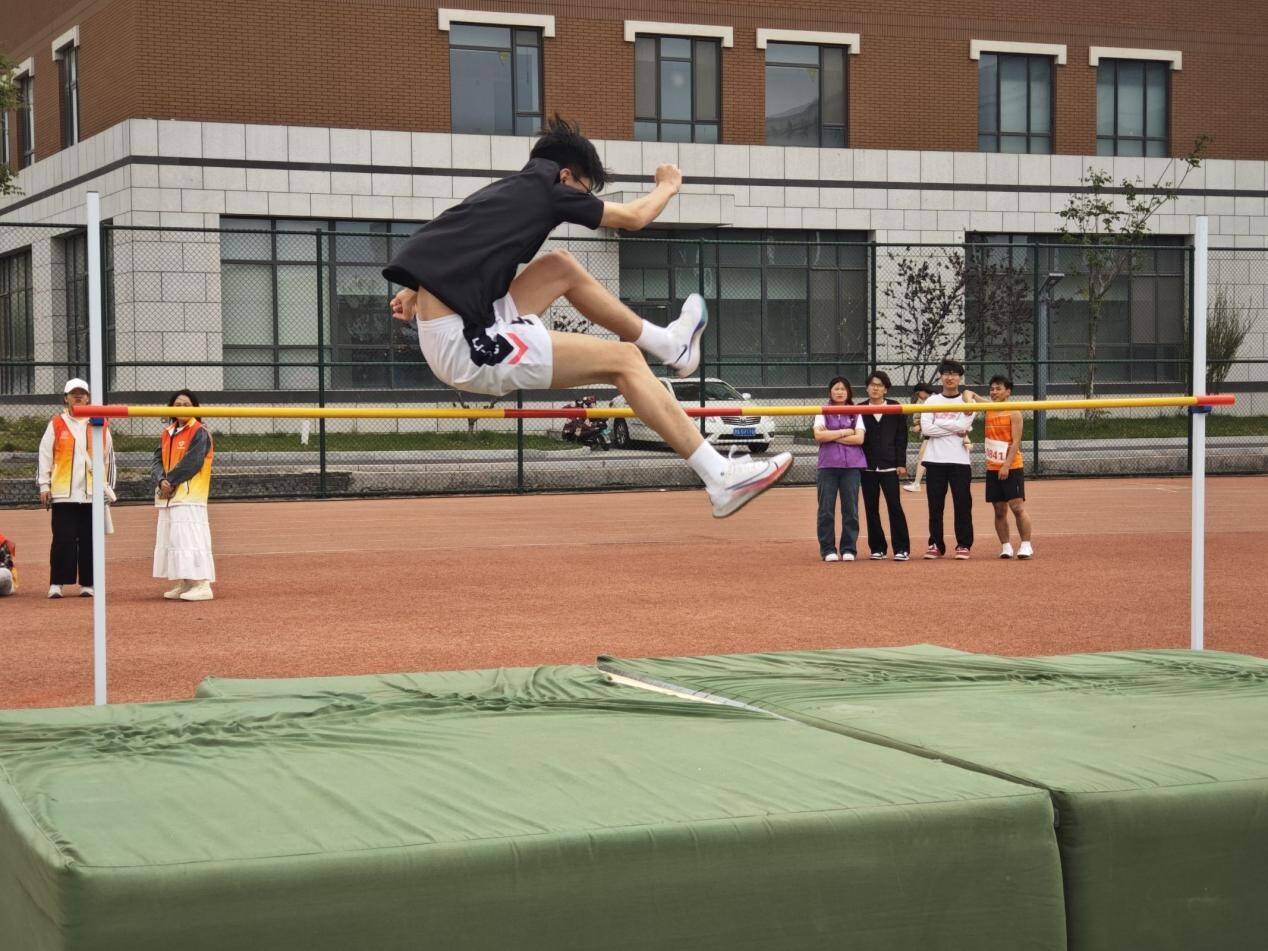 田赛区域,力与美的交响在此奏响。教职工们助跑时如离弦之箭,蹬地跃起,绷紧的肌肉在空中划出遒劲的抛物线;投掷者旋转发力,金属器械裹挟着呼啸声冲向远方。学生们在跳远、铅球、跳高项目中同样全力以赴。跳远沙池旁,健儿们如展翅鸿鹄,腾空而起,足尖轻点沙地,溅起细碎金光;铅球赛场,沉甸甸的铅球化作流星,在空中勾勒出力量的弧线,落地瞬间引得周围阵阵惊叹;跳高杆前,选手们似飞燕凌空,背越式腾挪间,将以柔克刚的优雅与超越自我的果敢完美融合。每一次奋力腾跃投掷,都展现出对“更高、更远”体育精神的追求。