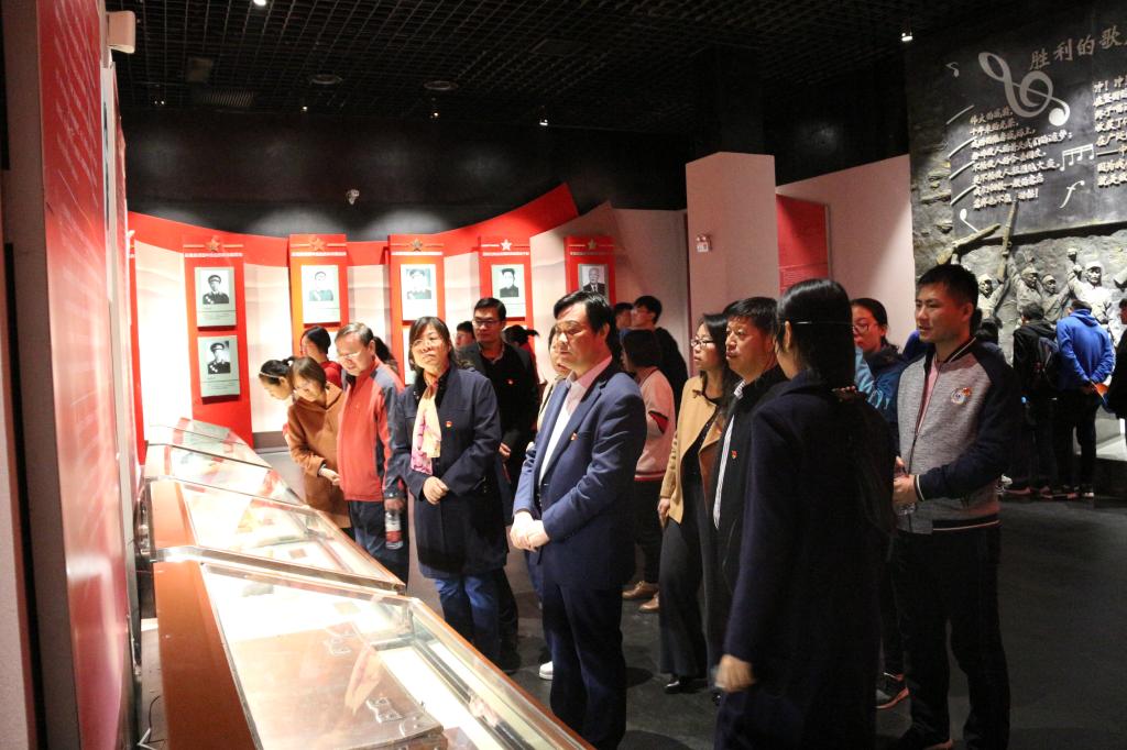 接下来,师生们来到烈士遗物和相册展区,重温了革命先烈“生死与共,血肉情深”的爱国精神,瞻仰了陈光、王秉璋、张仁初、刘西元等先烈的戎马一生。参观完毕之后,老师党员和讲解员讨论了先烈的英勇事迹,学生党员则在电子纪念板上为革命先烈们进献花环。