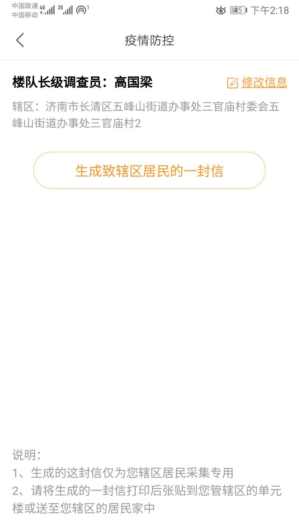 2月14日至2月15日期间,2017级临床药学本科1班的高国梁同学协助村委会录入村民信息,并通过爱城市网进行防疫普查工作,以实际行动践行志愿服务精神。