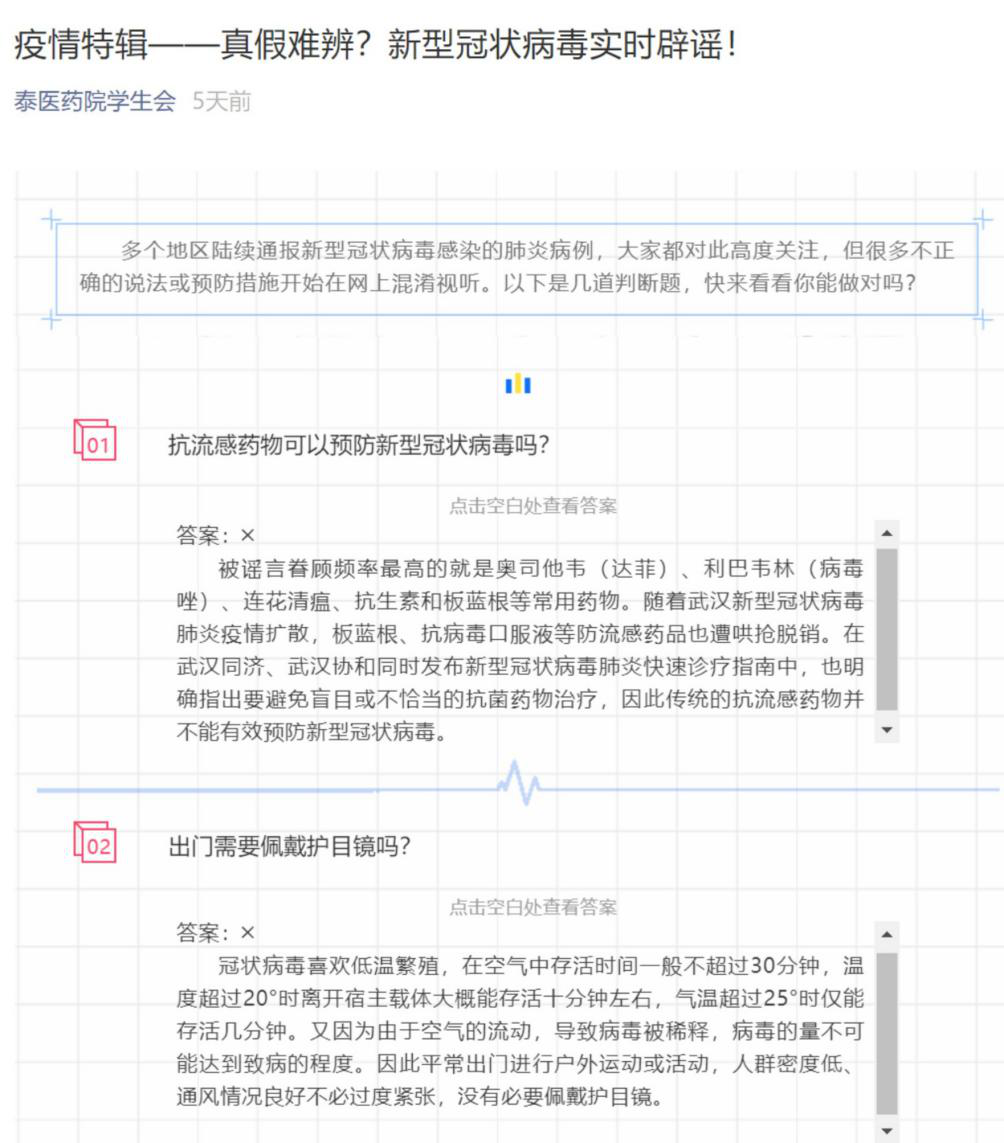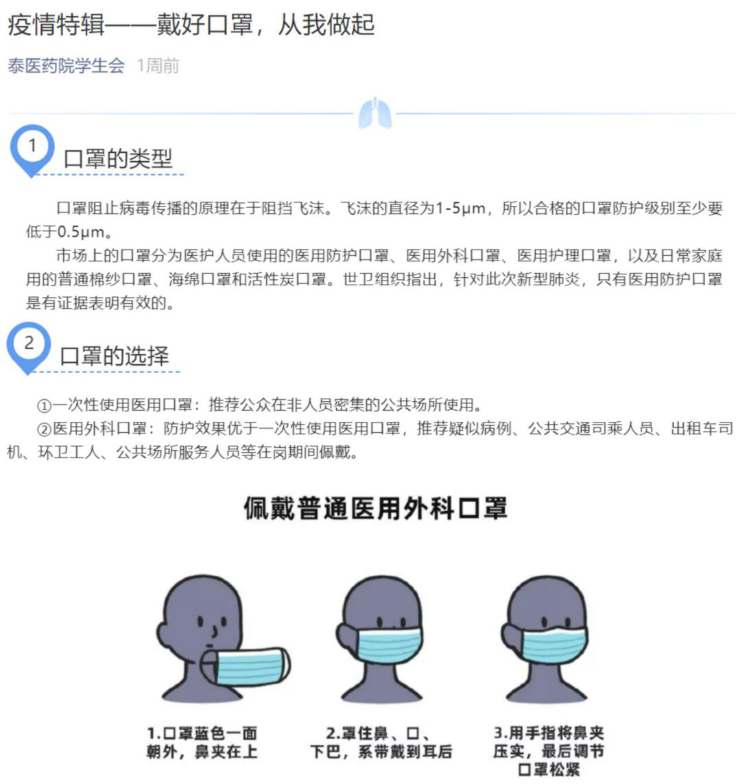 一、加强宣传,注重引导。充分利用网络媒体突出专业性、时效性、针对性及实用性,通过本院微信群及公众号向师生推送有关信息,内容涵盖新型冠状病毒的科普知识、研究进展、预防措施;全国疫情实时动态;网络谣言辟谣;公众心理疏导;致敬最美逆行者;疫情防控重大举措等各类板块,及时向师生传递科学防控知识,提高自我保护意识。