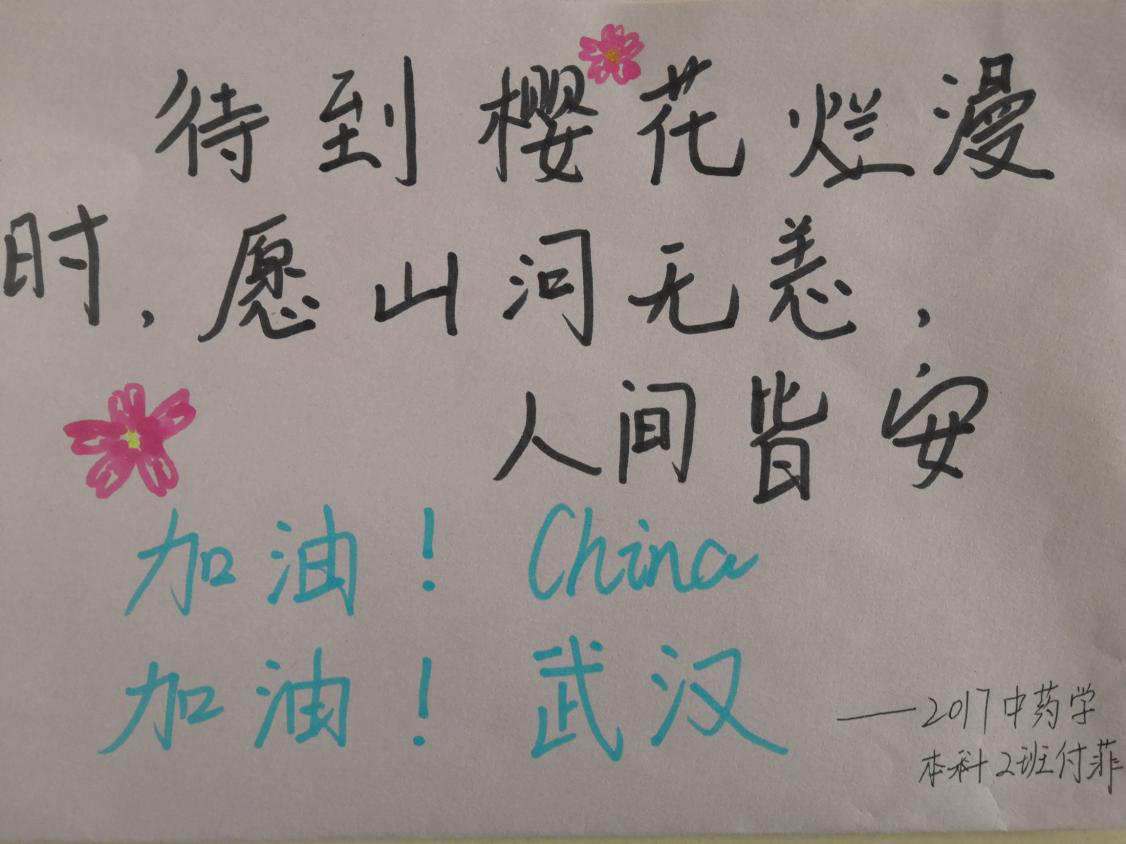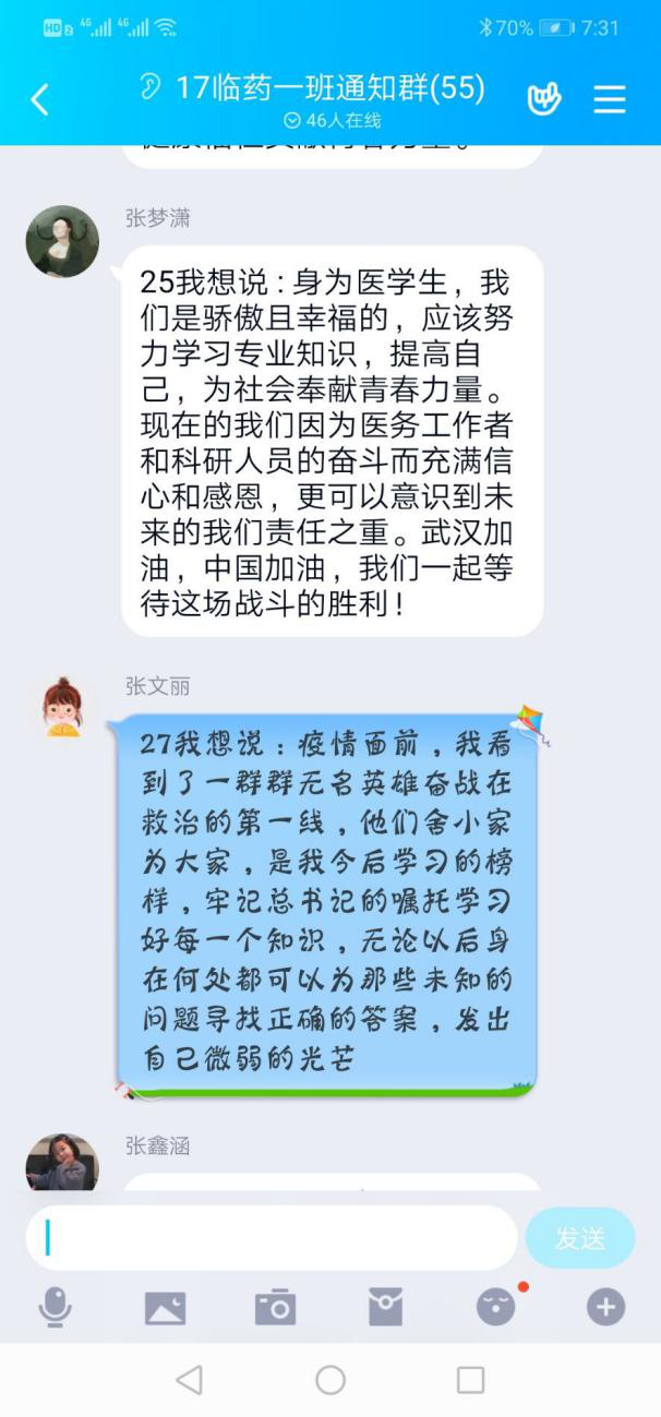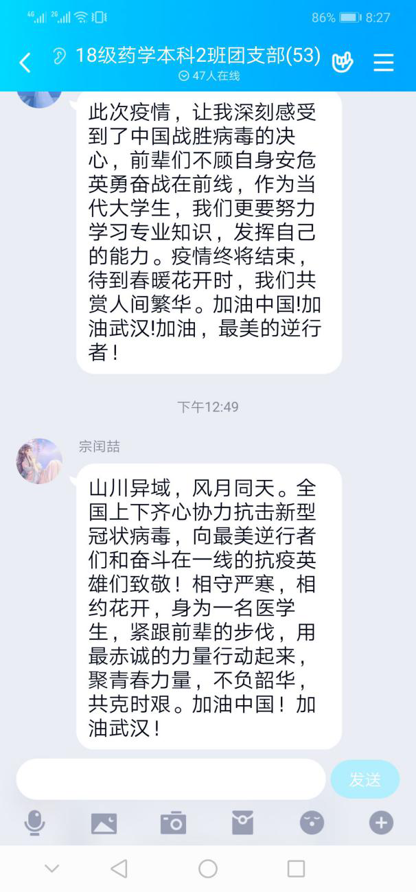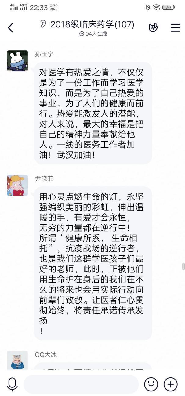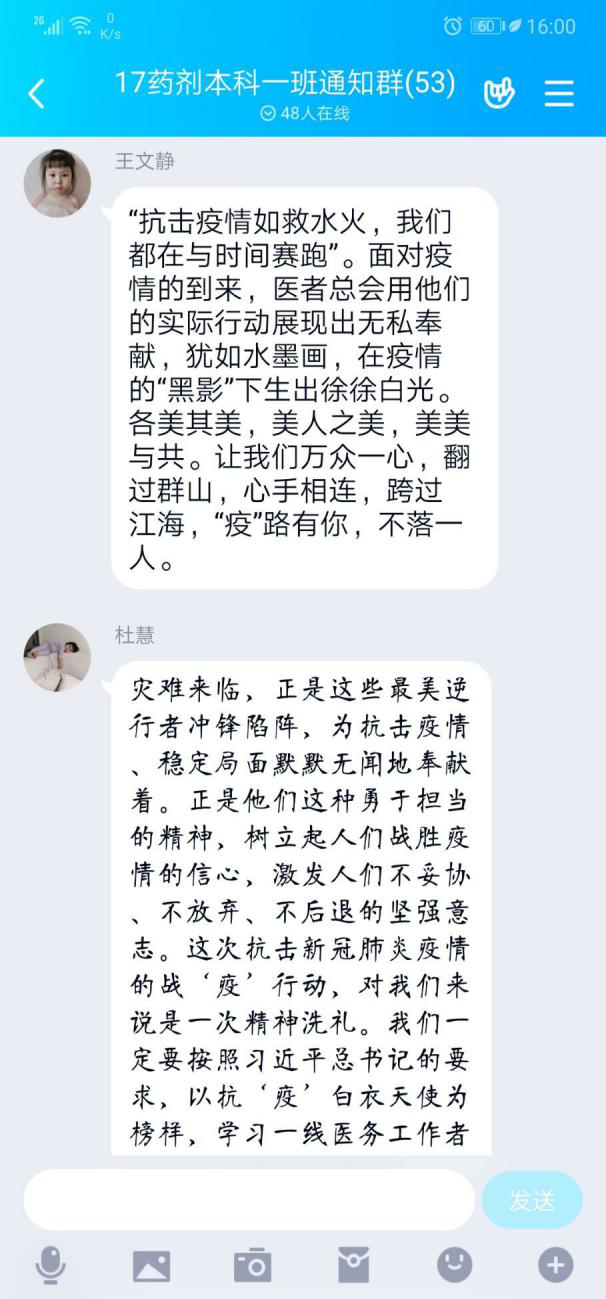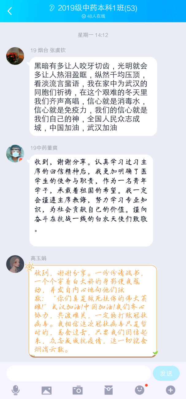 2019级药学本科1班鲍春玥同学说:“习近平总书记的回信给了奋战在医疗前线的战士们最大的鼓励与安慰,也坚定了我们必胜的信心。我们要致敬白衣天使,感谢他们不顾自身安危,奋战在疫情一线。作为医科大学的学生,我们也要尽力学好专业知识,积累经验,为以后走向工作岗位打下坚实的基础,为国家医疗事业的发展做出自己的贡献。”